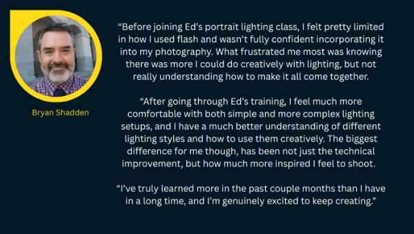 “Ed Verosky’s course is an excellent guide for anyone interested in portrait photography, especially those who haven’t used flash for portraits or are just getting started. Each segment provides solid information without overwhelming the viewer, and the presentation is clear and no-nonsense. You get specific information on what equipment you need, how to use it, where to place lights, camera and flash settings, and more. You can learn a great deal from this course and I definitely recommend it!”
